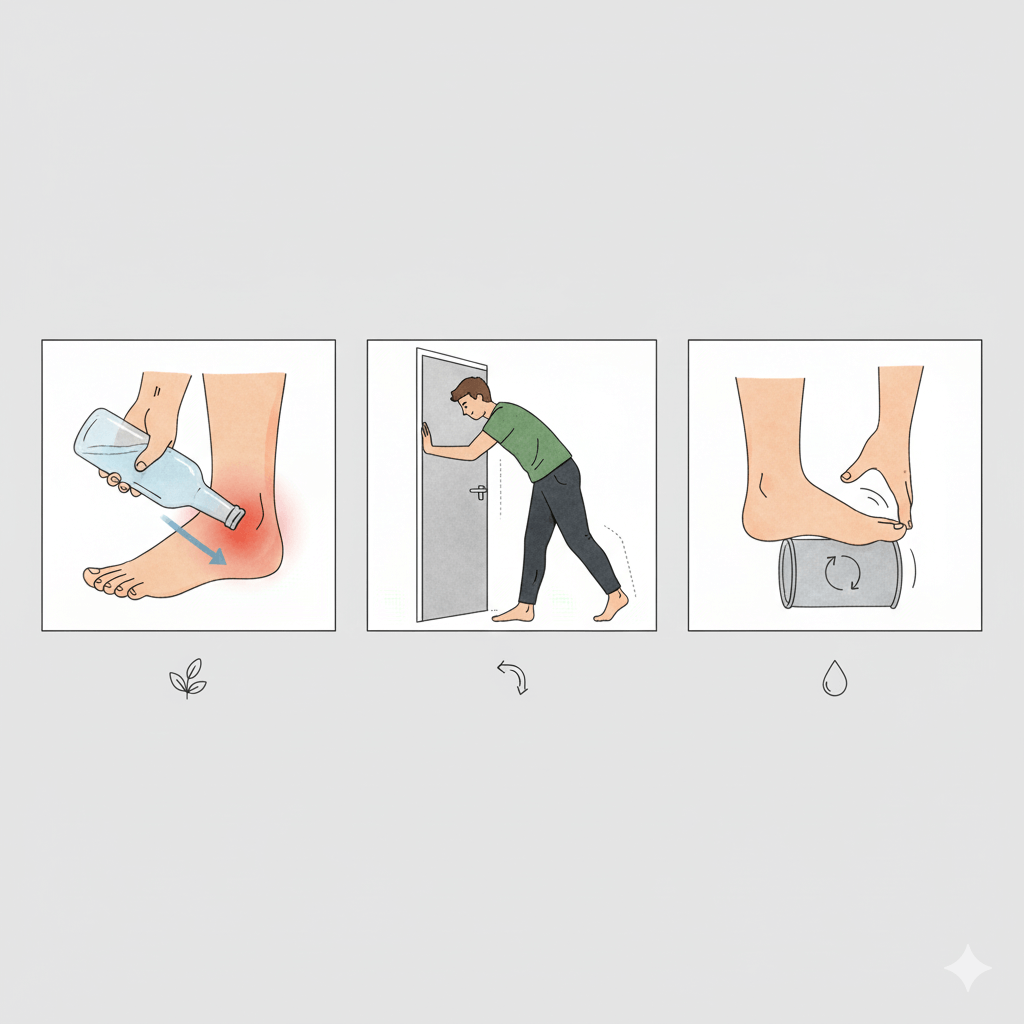 2. 물리치료와 마사지 통증이 아주 심한 급성기에는 테이핑 요법을 통해 발바닥을 지지해 주거나, 실리콘으로 제작된 발뒤꿈치 컵(Heel cup)을 신발 안에 넣어 충격을 흡수시켜 주는 것이 도움이 됩니다. 집에서는 캔이나 골프공을 발바닥에 놓고 굴리는 마사지를 하거나, 아킬레스건을 늘려주는 스트레칭을 수시로 해주는 것이 좋습니다. 따뜻한 물과 찬물에 번갈아 발을 담그는 대조욕도 혈액순환을 돕고 통증을 줄이는 데 효과적입니다.