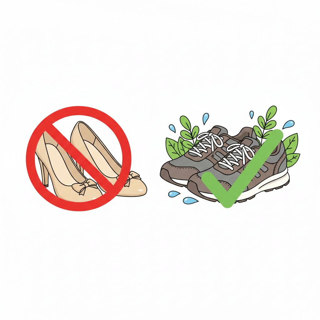 - 피해야 할 신발: 너무 꽉 끼는 신발, 뒷굽이 너무 낮아 충격 흡수가 안 되는 플랫슈즈, 바닥이 딱딱한 구두.