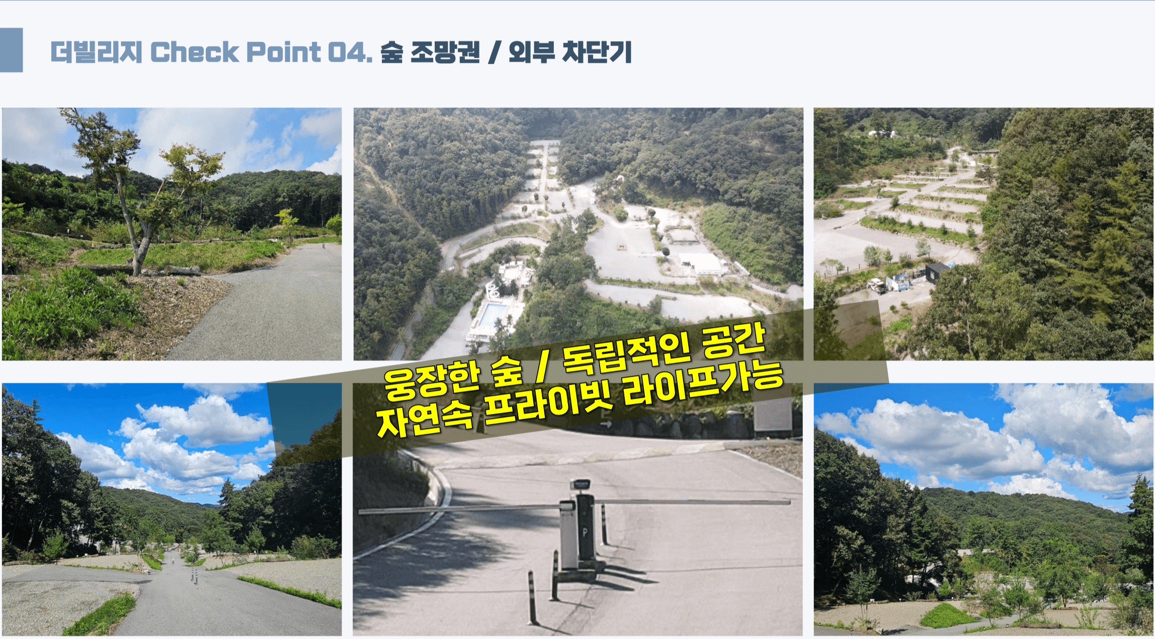 무엇보다 돋보이는 점은 자연 조망과 프라이버시 확보입니다. 단지 전체가 숲에 둘러싸여 있으며, 필지마다 고도 차이를 두어 햇살과 바람이 고르게 스며드는 구조입니다. 사계절 내내 자연의 변화를 느낄 수 있는 주거환경은 도시에서 얻기 어려운 ‘쉼’을 제공합니다.