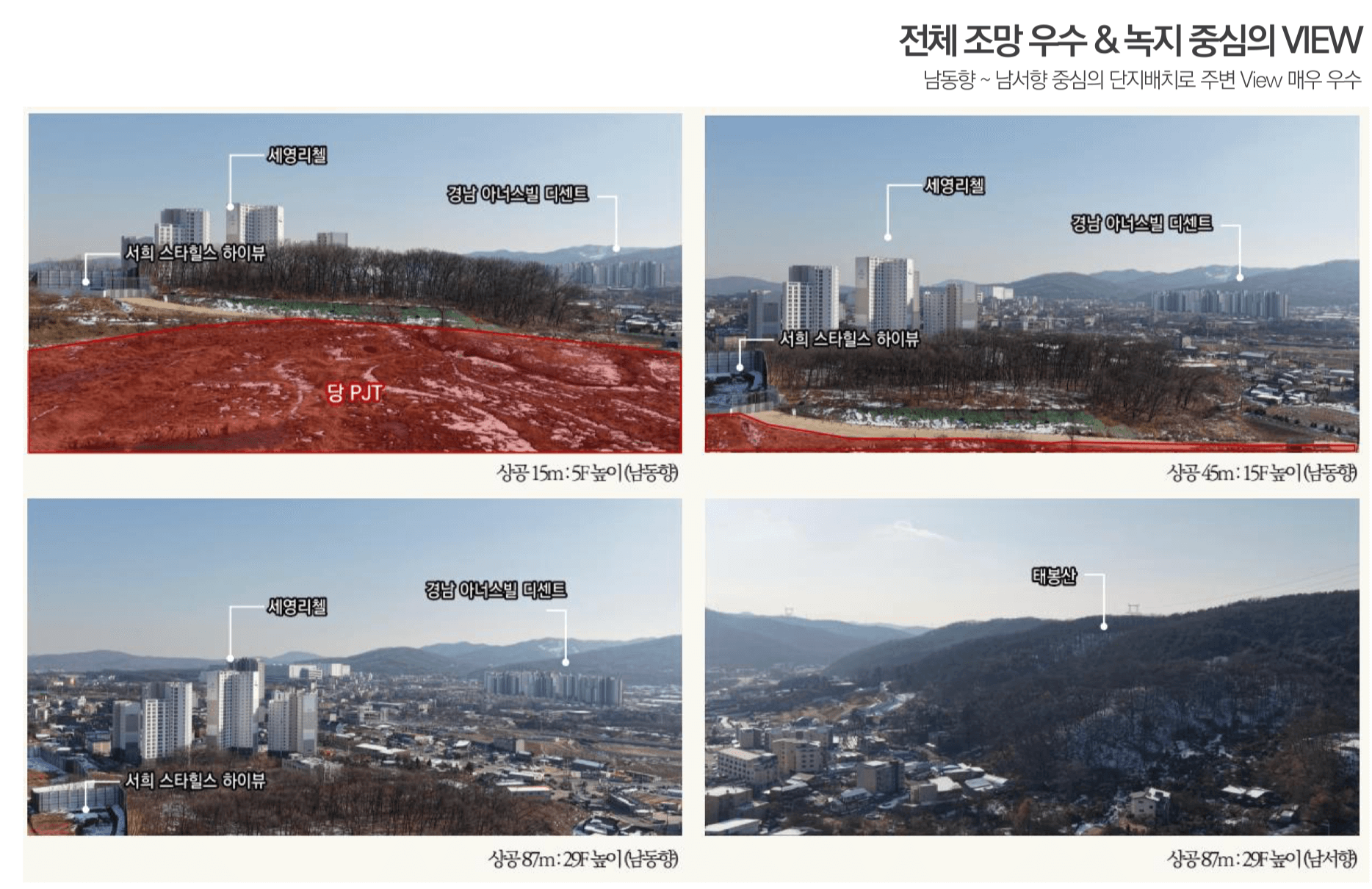 단지는 태봉산과 노적산, 근린공원 등 풍부한 녹지로 둘러싸여 있어 쾌적한 주거환경을 제공합니다. 또한 양지체육공원, 수목원, 캠핑장 등 다양한 생활 인프라도 인근에 위치하고 있어 주거 만족도가 높습니다.