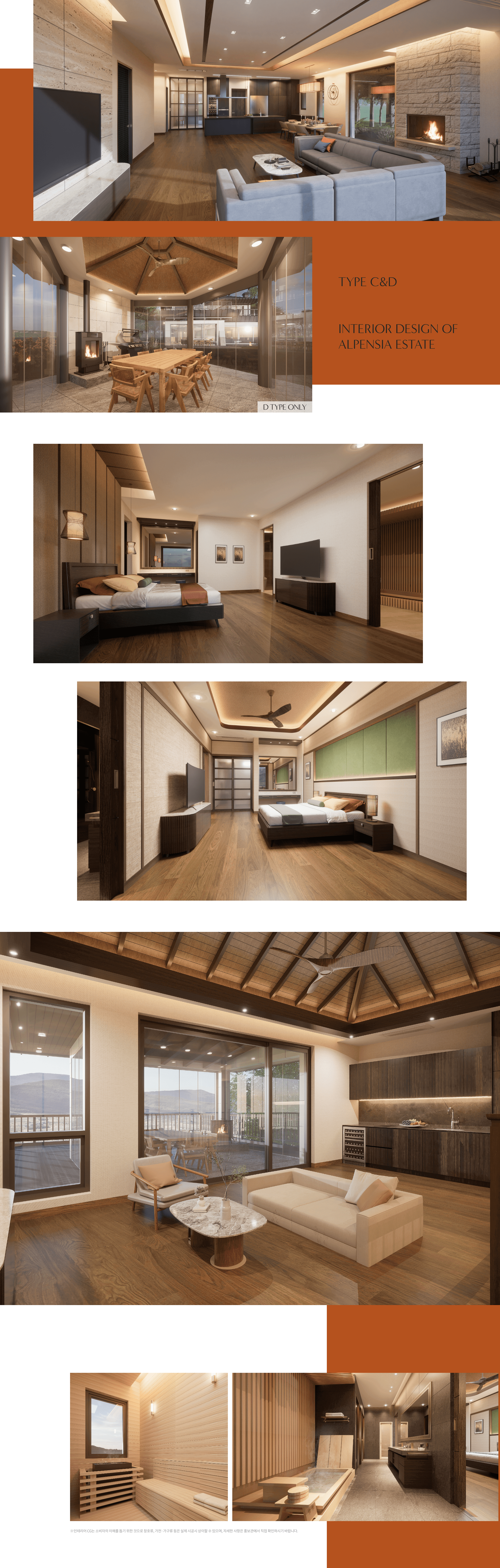 알펜시아 에스테이트는 우성그룹의 오병환 회장이 직접 설계와 인테리어에 참여해 최고급 주택으로 완성되었습니다. 신규 조성된 60실에는 다음과 같은 고급 사양이 적용되었습니다:
