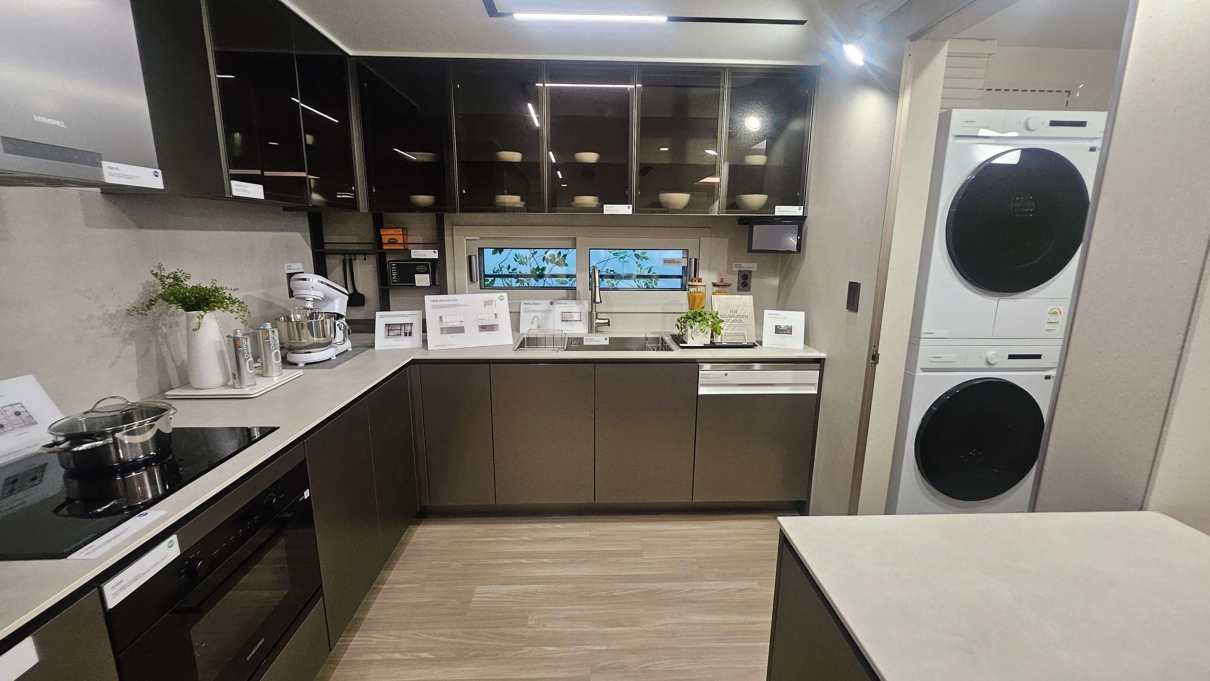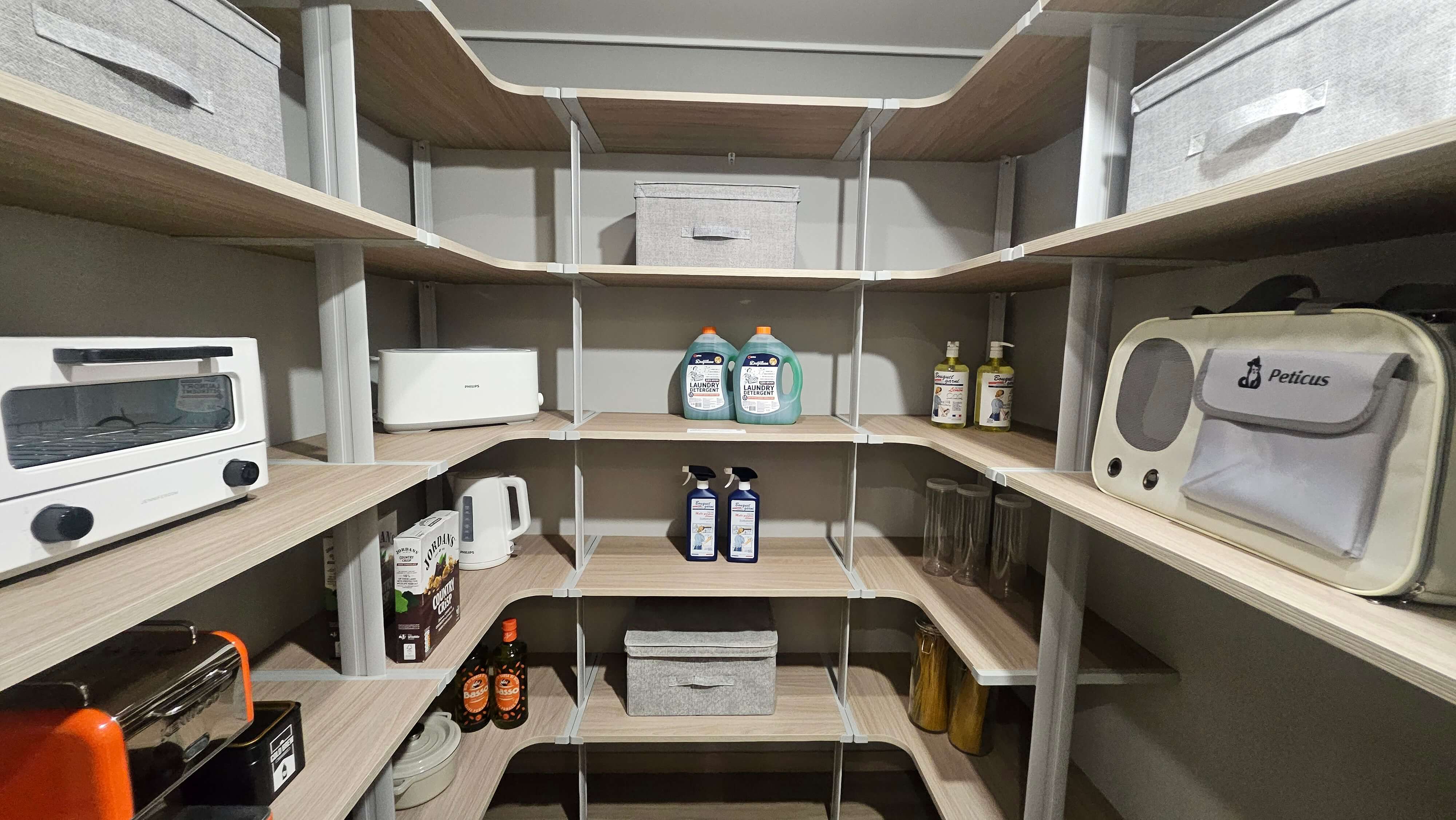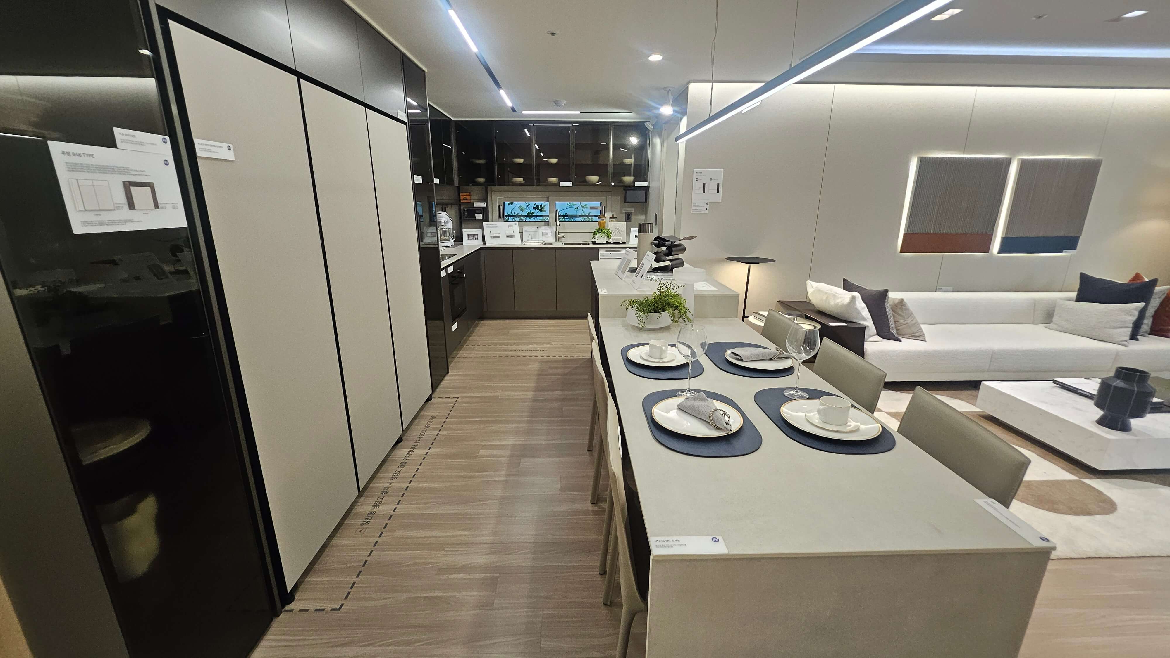 또한 현관과 복도에는 팬트리 공간이 두 곳 마련되어있고, 주방은 ㄷ자형 구조로 다용도실과 연결되어 가족 모두의 생활 편의성을 높였습니다. 발코니 확장 시에는 팬트리 시스템 가구, 침실 붙박이장, 엔지니어드 주방 상판이 기본 제공된다는 점도 장점입니다.