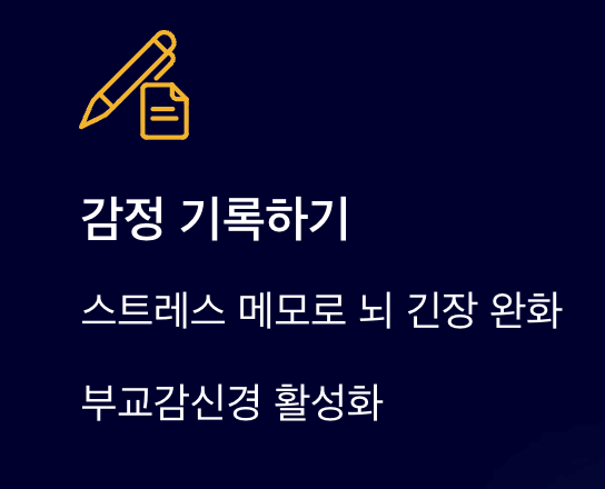 - 감정 기록하기 : 스트레스를 느꼈을 때 바로 메모하거나 말로 표현하면, 뇌가 긴장을 풀고 부교감신경이 작동하기 시작합니다.