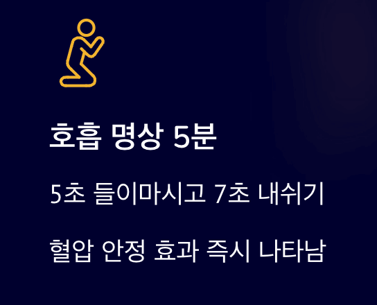 - 호흡 명상 5분 : 눈을 감고 천천히 5초간 들이마시고 7초간 내쉽니다. 이 단순한 호흡이 혈압을 안정시키는 효과가 있습니다.