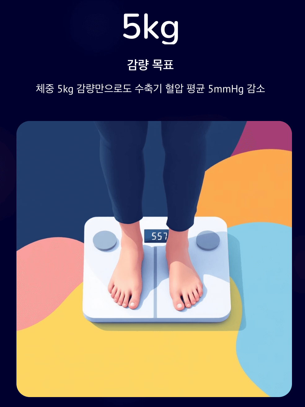 - 체중 5kg 감량만으로도 수축기 혈압이 평균 5mmHg 낮아진다는 연구가 있습니다.
