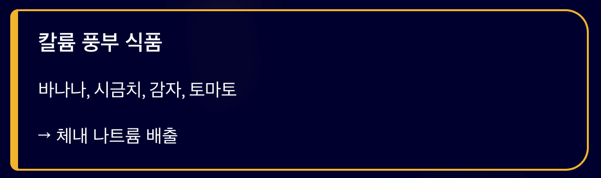 - 칼륨이 풍부한 식품 : 바나나, 시금치, 감자, 토마토는 체내 나트륨을 배출시켜줍니다.