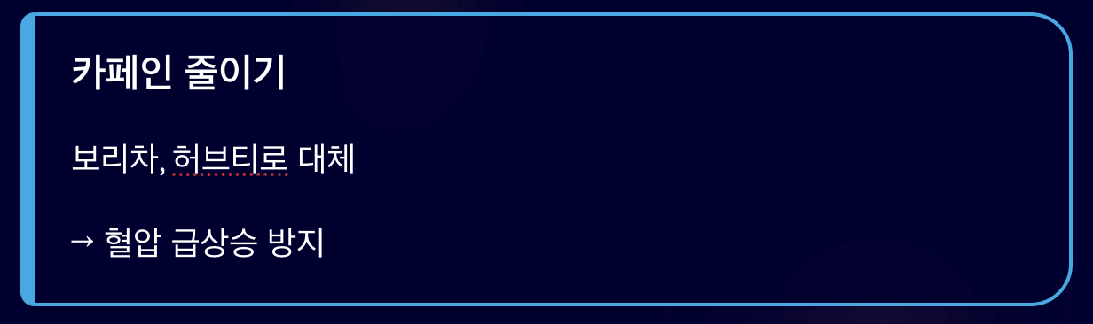 - 카페인 줄이기 : 커피나 에너지 음료를 자주 마시면 순간적으로 혈압이 상승합니다. 대신 보리차나 허브티를 추천드립니다.