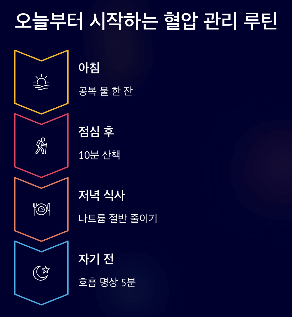 이 루틴은 꾸준히 실행할수록 신체가 ‘기억’합니다. 약을 줄이고도 건강한 혈압을 유지할 수 있게 됩니다.