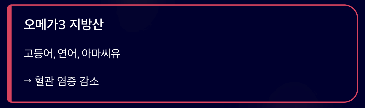- 오메가3 지방산 : 고등어, 연어, 아마씨유 등은 혈관 염증을 줄이고 혈류를 부드럽게 만듭니다.