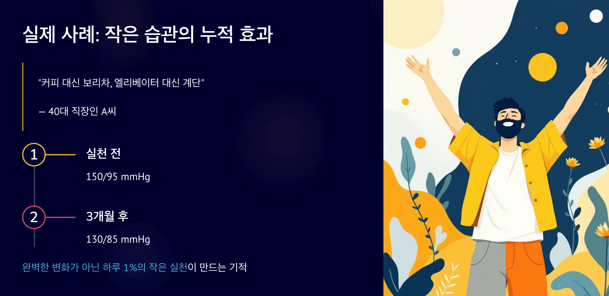 많은 분들이 “운동할 시간도 없고, 짠 음식을 못 끊겠어요”라고 말합니다. 하지만 완벽하게 바꾸지 않아도 됩니다. 하루에 단 1%의 변화만 해도 효과는 누적됩니다.