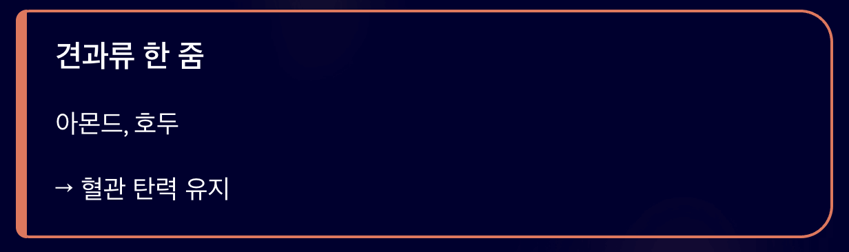 - 견과류 한 줌 : 아몬드, 호두는 좋은 지방을 제공해 혈관 탄력을 유지시킵니다.