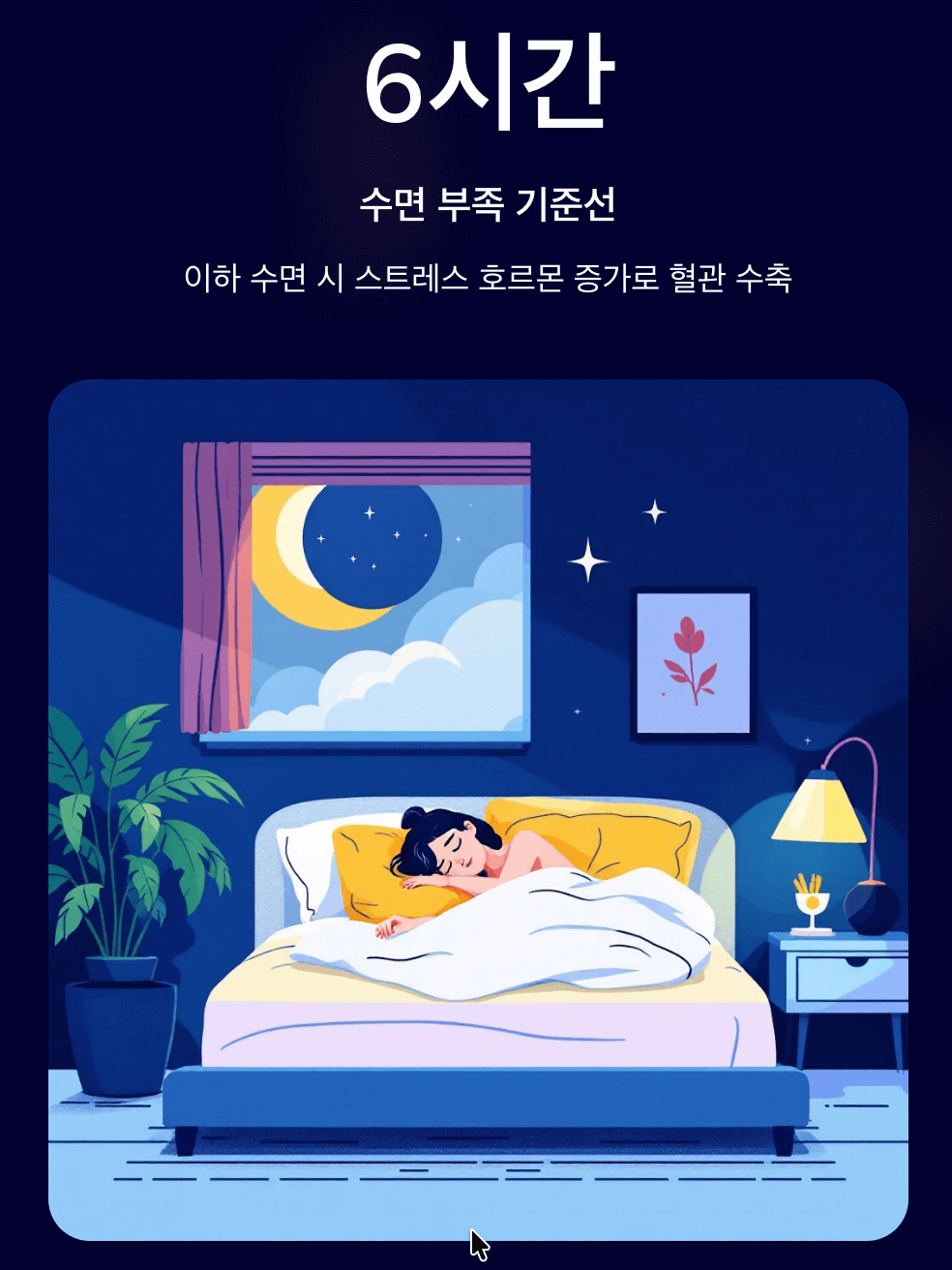 - 수면 부족은 혈압 상승의 직행로입니다. 하루 6시간 이하의 수면은 스트레스 호르몬 분비를 증가시켜 혈관을 수축시킵니다.
