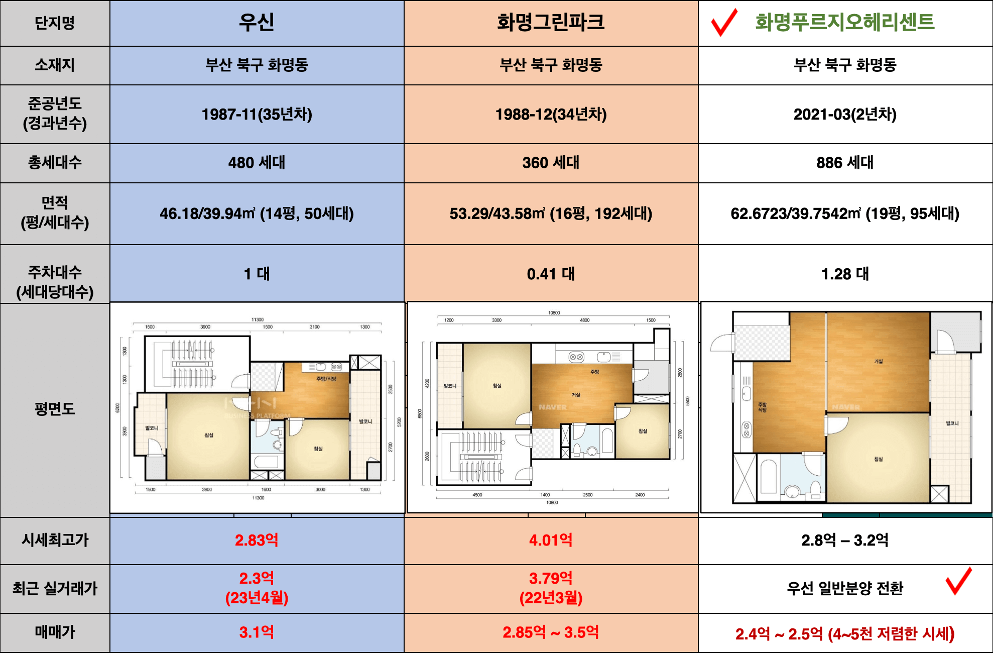 화명 푸르지오 헤리센트는 입주 2년 된 신축아파트로 대우건설의 1군 브랜드에 속하며 배치나 내부 구조 등에서 우수합니다. 주변에 있는 소형 아파트들은 대부분 입주한 지 30년이 지난 곳이 많고 가격이 이미 상승한 상태입니다. 반면 화명 푸르지오 헤리센트는 최초 분양가로 소유할 수 있는 마지막 기회이며, 시세차익을 볼 수 있는 잠재력이 높습니다.