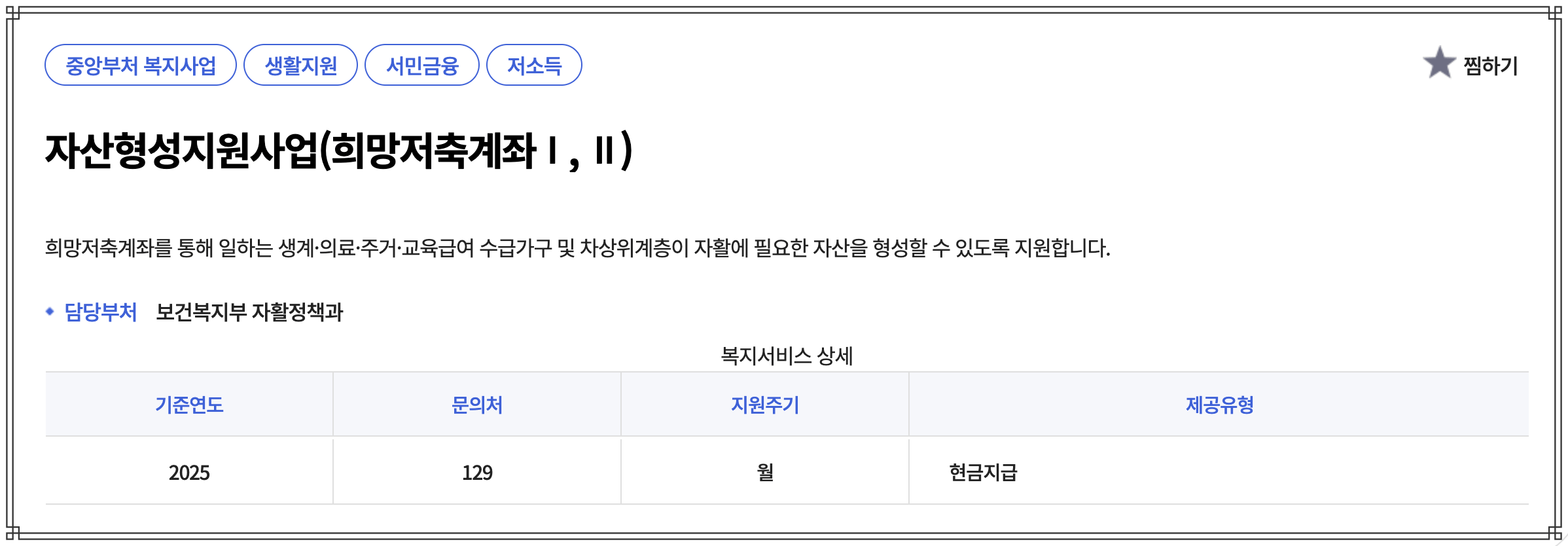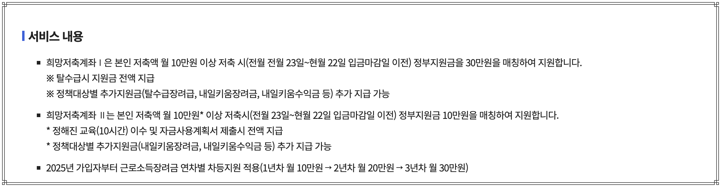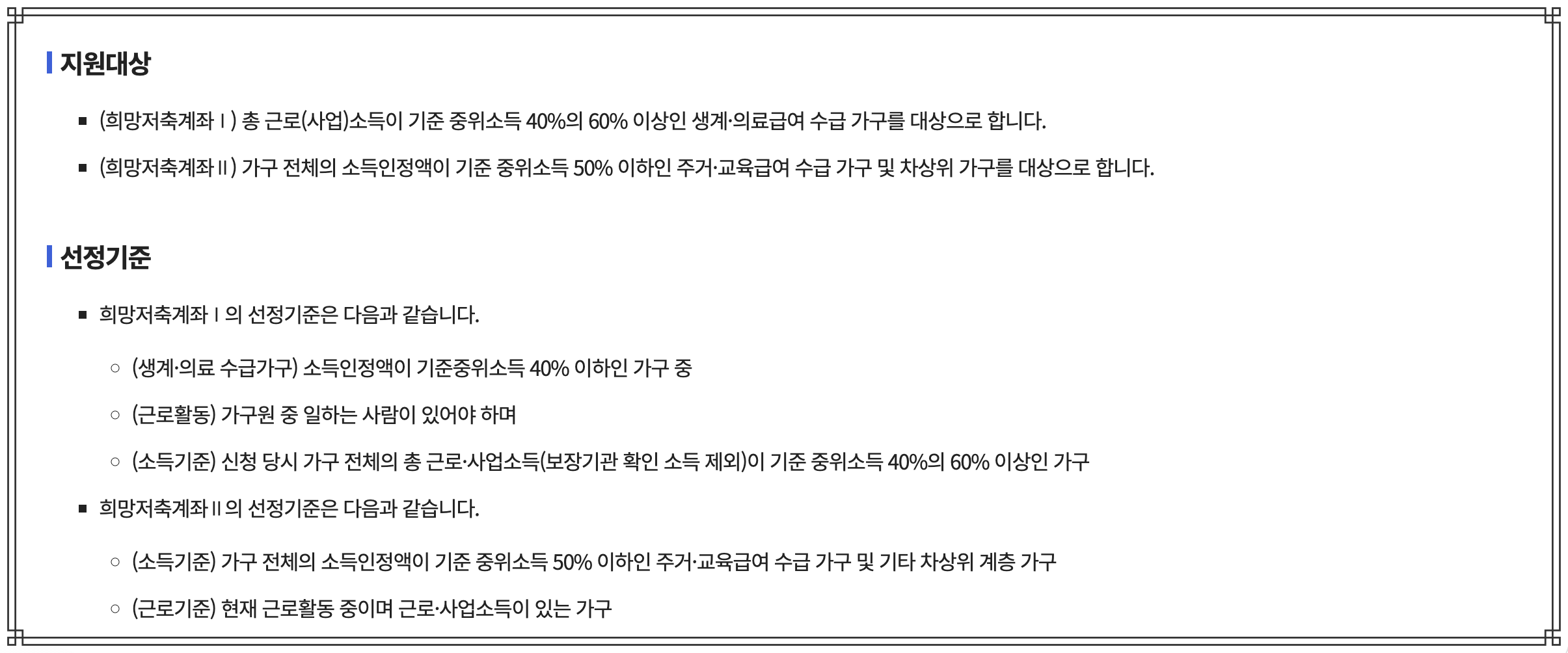 - 한 가구당 1회만 신청 가능하며, 기존 ‘희망저축계좌Ⅰ’ 수혜자는 중복 신청이 불가합니다.