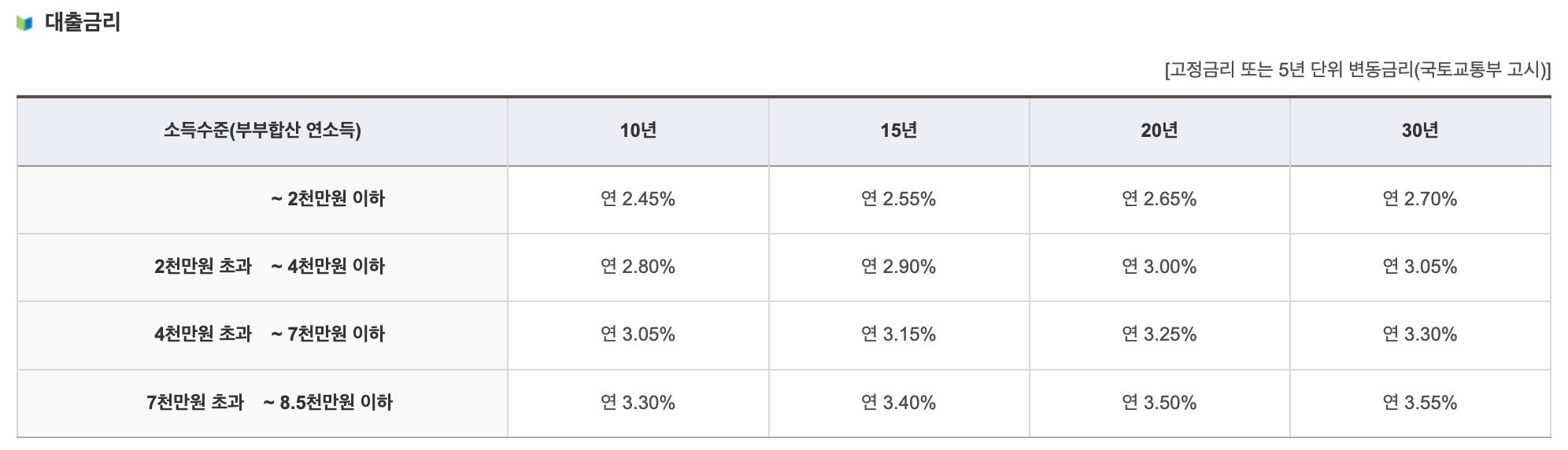 내집마련 디딤돌 대출의 대출금리는 연 2.45% ~ 3.55%입니다. 고정금리 또는 5년단위 변동금리를 선택할 수 있습니다. 또한 한부모가구, 장애인가구, 다문화가구, 신혼가구, 생애최초주택구입자 등에게는 우대금리를 적용해 줍니다. 예를 들어, 청약저축 가입자와 다자녀가구라면 최대 연 1.2%p까지 우대받을 수 있습니다. 단, 우대금리 적용 후 최종금리가 연 1.5% 미만인 경우에는 연 1.5%로 적용됩니다.