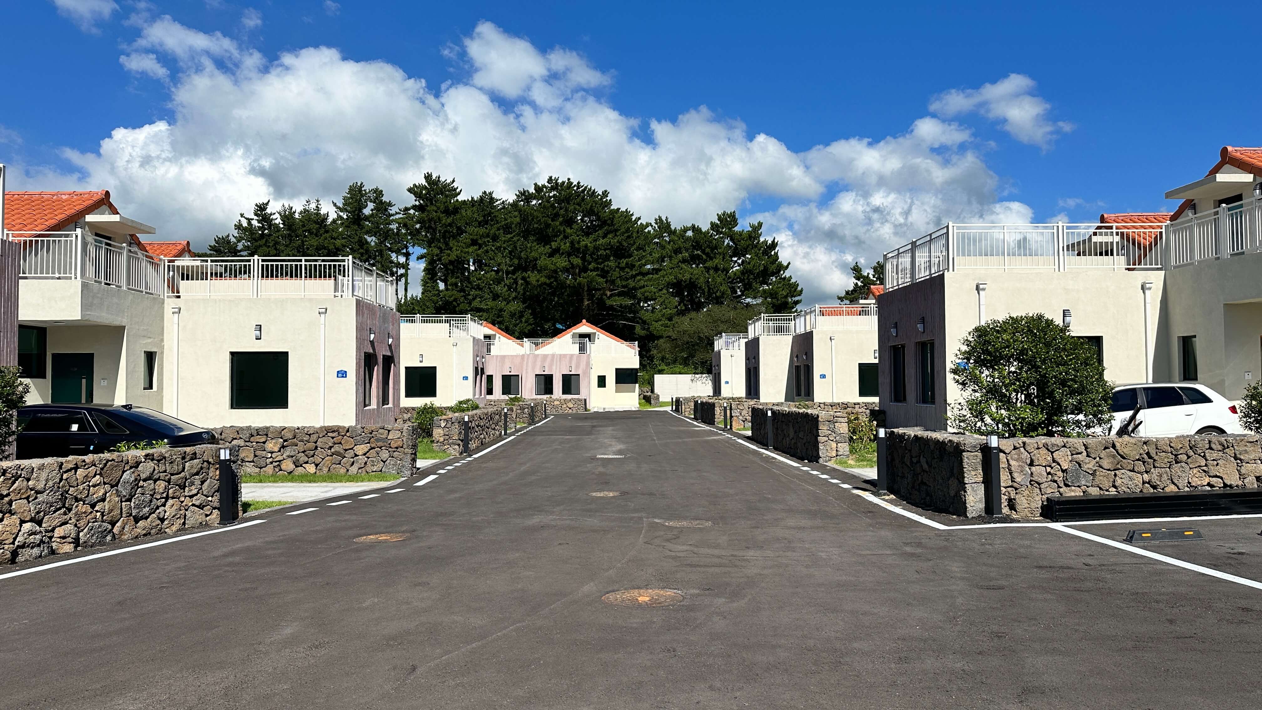 2층 테라스에서는 한라산을 조망할 수 있어 도시 생활의 답답함을 해소하며, 진정한 휴식을 제공합니다. 단지 내에는 약 12m의 큰 도로가 가로지르며, 전체 단지가 3면으로 작은 산들로 둘러싸여 조용하고 쾌적한 환경을 제공합니다.