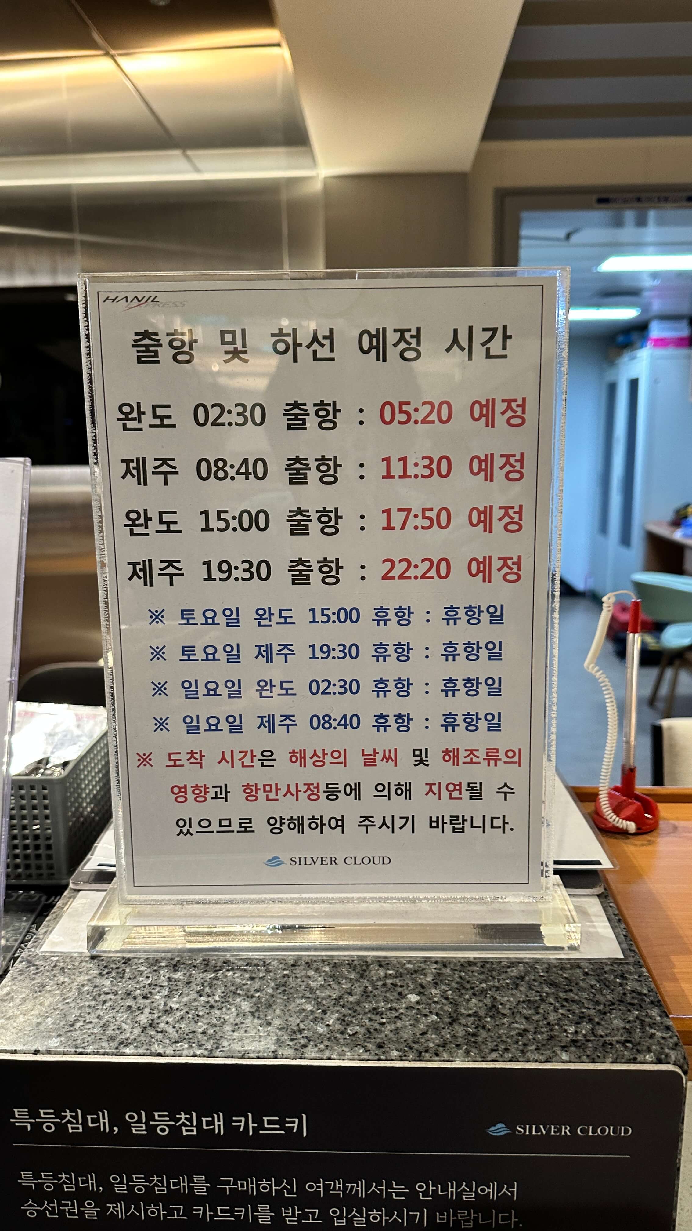 - 휴항일: 완도발 토(15:00), 일(02:30) / 제주발 토(19:30), 일(08:40)
