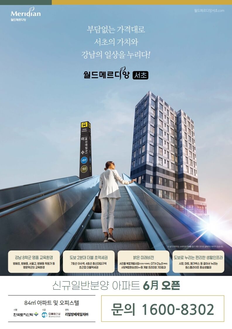 서울 부동산 시장에서 꾸준한 인기를 끌고 있는 서초구 방배동. 그중에서도 교통, 교육, 개발호재를 두루 갖춘 이수역 인근에 들어서는 월드메르디앙 서초가 큰 주목을 받고 있습니다. 강남권에서 만나기 어려운 합리적인 분양가와 실속형 구조, 그리고 미래가치를 갖춘 이 단지는 실수요자와 투자자 모두에게 매력적인 선택지가 될 것입니다. 지금부터 월드메르디앙 서초에 대한 상세한 분양 정보를 소개해 드릴게요.