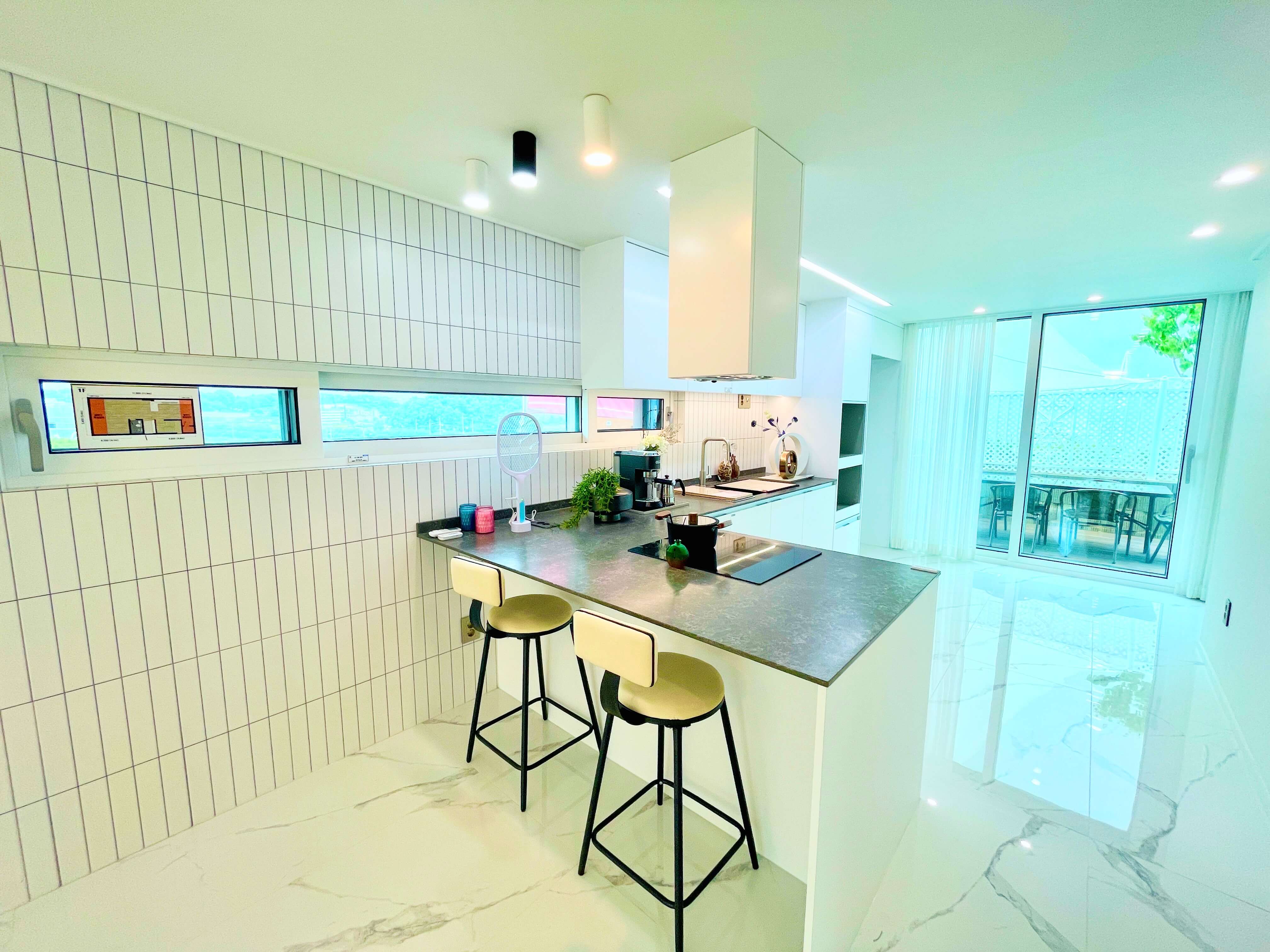 넓은 창문으로 들어오는 햇살과 화이트톤의 내부 디자인이 조화로운 공간입니다. 주방과 연결된 마당과 마당테라스는 자연과의 소통을 느낄 수 있는 공간입니다.